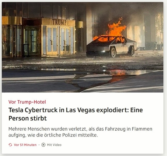 «Bei einem Zwischenfall mit einem Cybertruck des Autoherstellers Tesla vor dem Trump-Hotel in der US-Stadt Las Vegas ist eine Person ums Leben gekommen.»