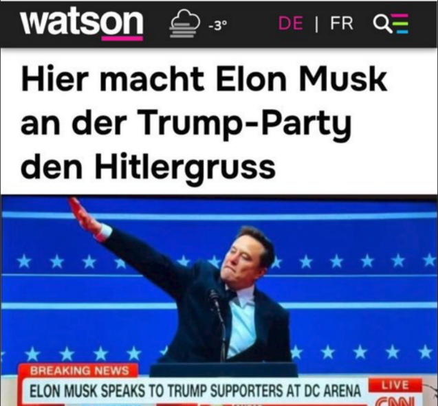 Zu Beginn seiner Rede im Anschluss an Trumps Amtseinführung habe sich Musk zweimal zum Hitlergruss hinreissen lassen, so die ungeheuerliche Aussage von Watson. Damit nicht genug: «Reaktionen des Publikums waren keine zu vernehmen, das Kollektiv schien sich an Musks Gesten nicht gestört zu haben» vermeldet Watson, um zu suggerieren, dass auch Trumps Anhänger Nazis seien.