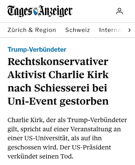 «Rechtskonservativer Aktivist Charlie Kirk nach Schiesserei bei Uni-Event gestorben» (Tages-Anzeiger vom 11.9.25)