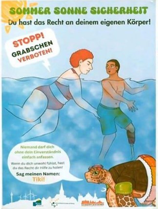 Nicht aus der Zeitung, aber auch eine Manipulation: Im Sommer 2025 hing im Freibad Büren (NRW) das Plakat „Sommer Sonne Sicherheit“ – es zeigte eine weisse Frau, die eine dunkelhäutige Person mit Holzbein belästigt, versehen mit dem Slogan „Stopp – Grabschen verboten“. Das Bild suggeriert, dass weisse Frauen eine Gefahr für junge Flüchtlinge seien.