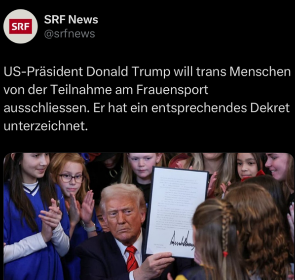 So die tendenziöse Schlagzeile, die so tut, als wolle Trump «trans-Menschen» generell aus dem Sport verbannen, obwohl es konkret um die Frage ging, ob biologisch männliche Personen in Frauenkategorien antreten dürfen – ein legitimes Streitthema, das SRF auf eine Empörungsformel verkürzte.