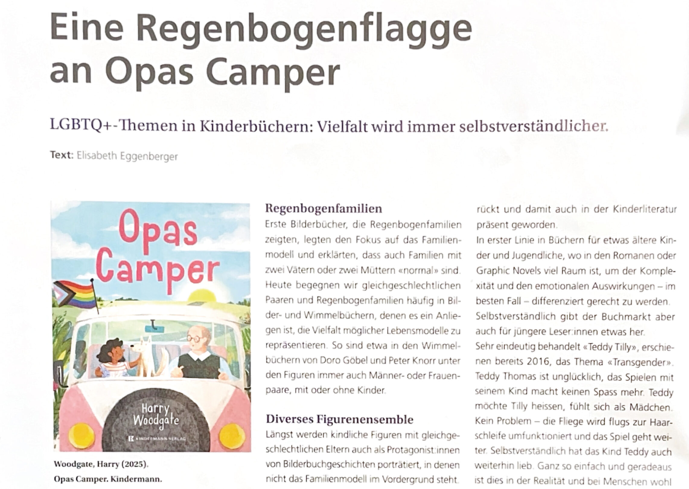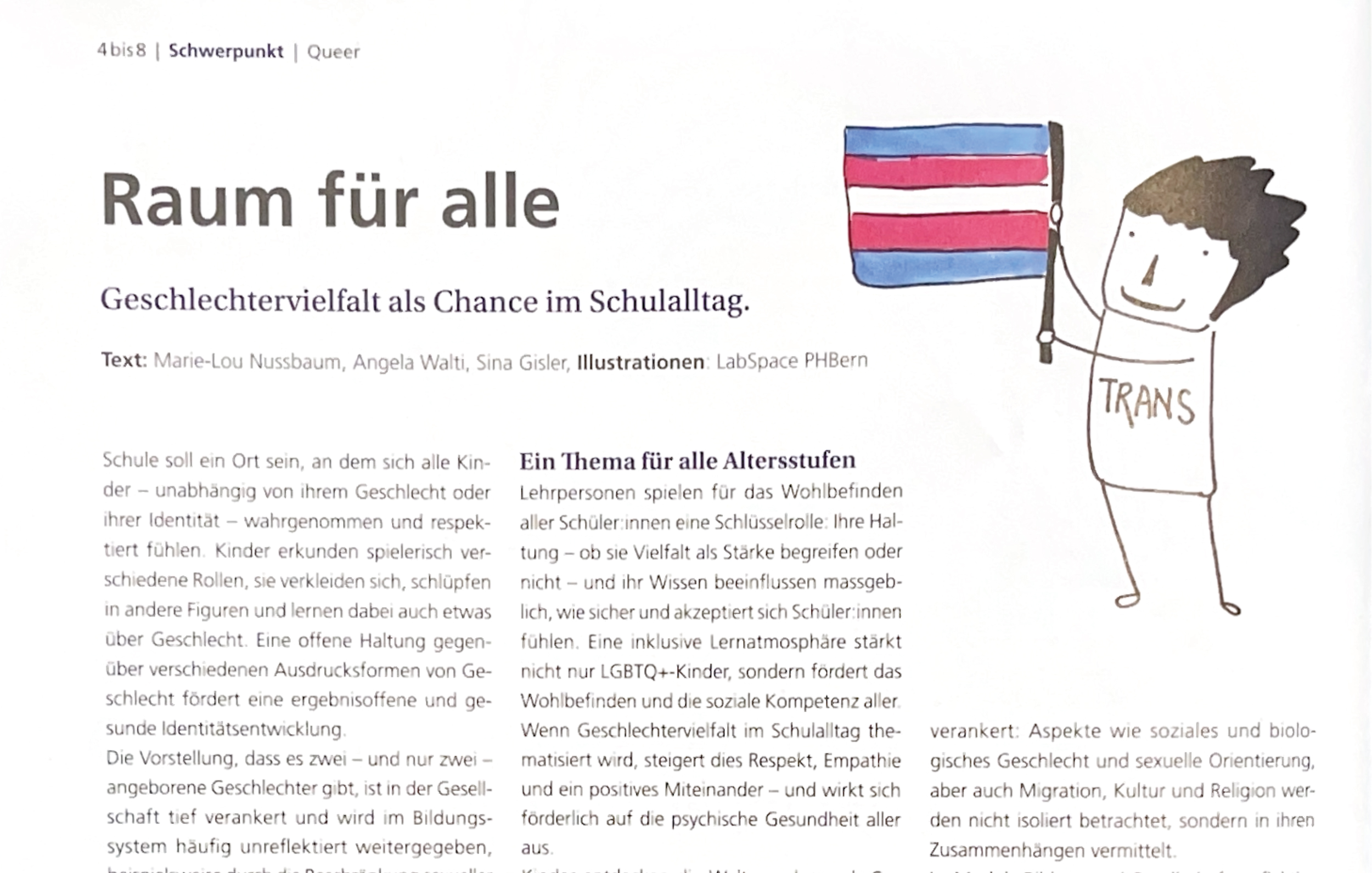 Es gibt nicht nur Lehrmittel, welche im Schulunterricht zu behandeln und voll mit subtiler oder weniger subtiler Transpropaganda sind. Es gibt auch allerhand Publikationen, die sich direkt an die Lehrer und weitere Anspruchsgruppen richten. Eine dieser Publikationen ist die «Fachzeitschrift ‹4 bis 8› für den Kindergarten und die Unterstufe», herausgegeben vom Schulverlag plus. Laut Eigenbeschrieb richtet sie sich an «Lehrpersonen von Kindergarten, Unterstufe sowie Grund- und Basisstufe, Studierende, Dozentinnen und Dozenten von Pädagogischen Hochschulen, Erzieherinnen und Erzieher in Kitas, Krippen und Spielgruppen, Eltern, Schulbehörden».