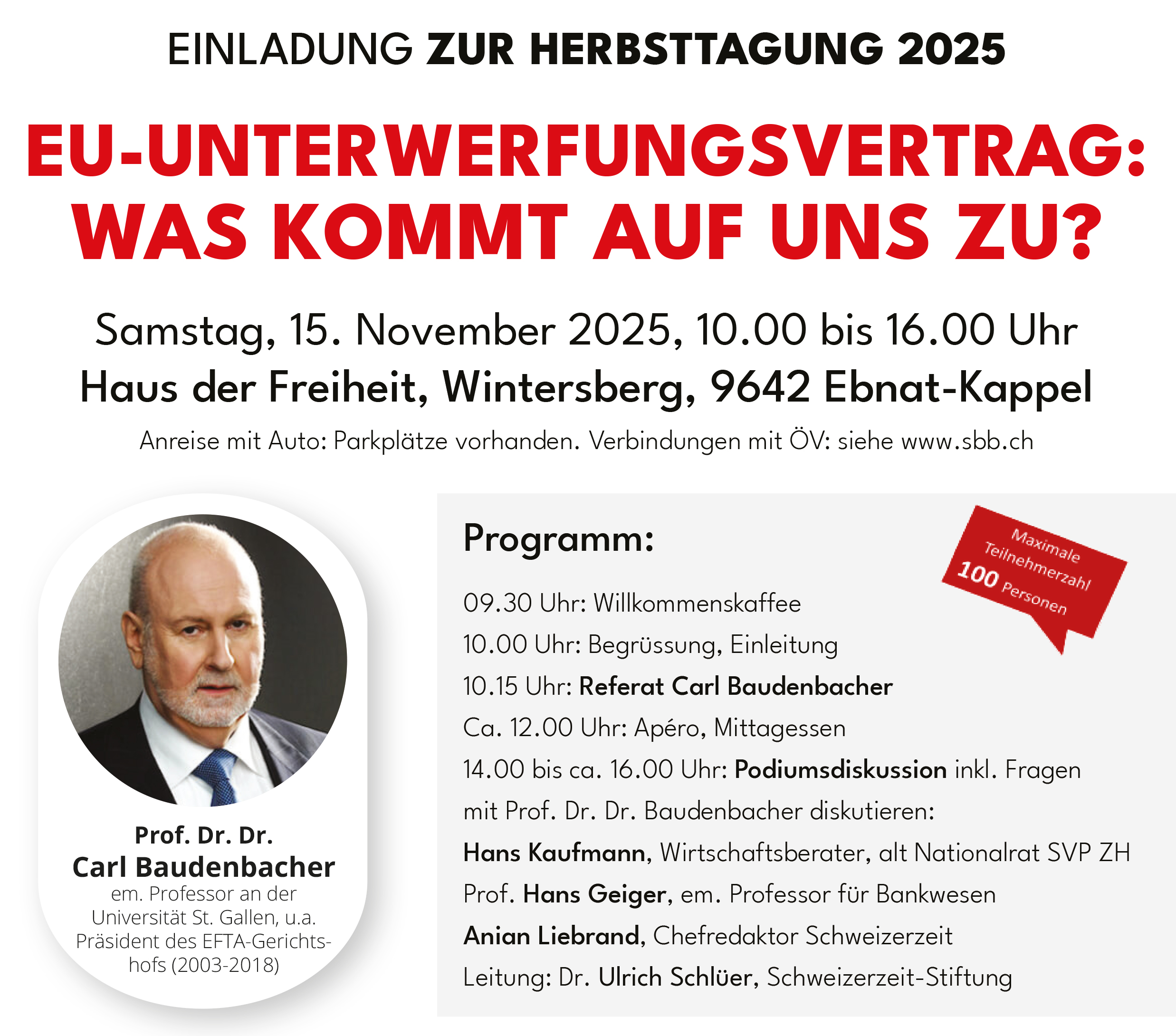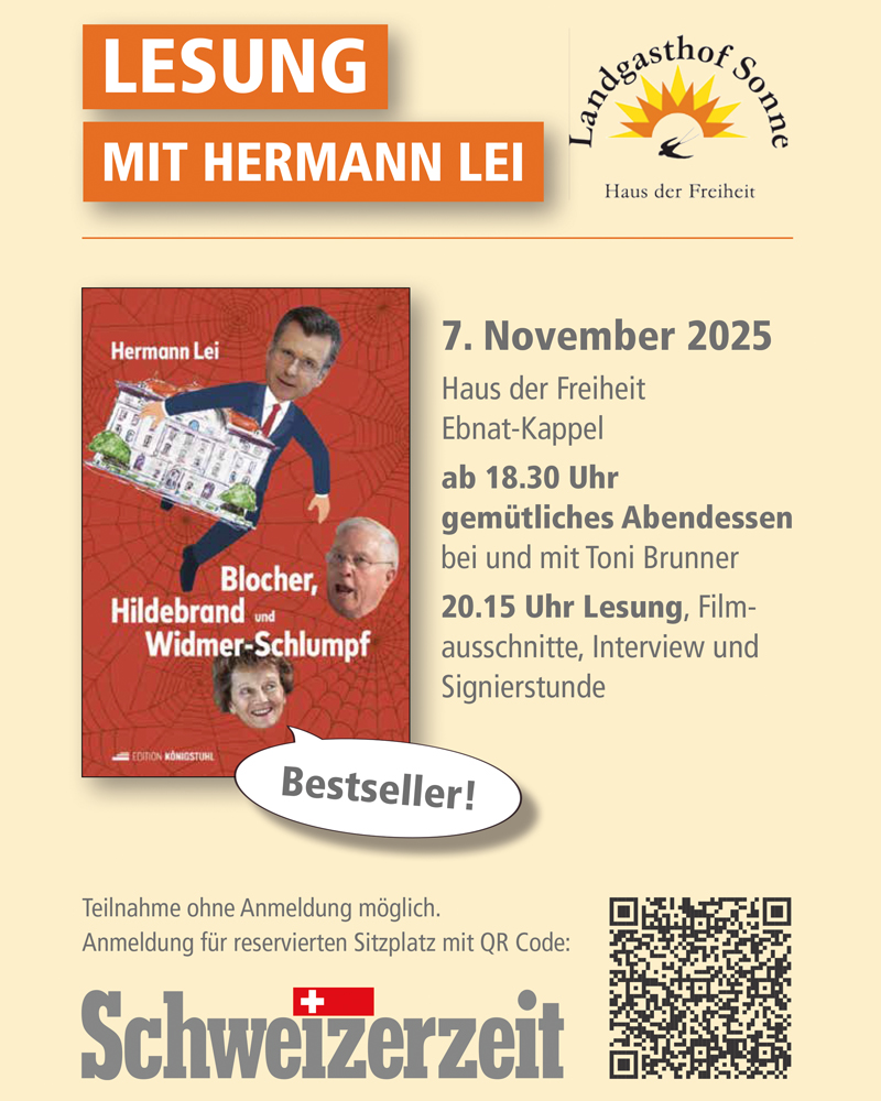 Landgasthof Sonne, Haus der Freiheit Wintersberg,Ebnat-Kappel,St. GallenLesung mit Hermann Lei, Rechtsanwalt und Kantonsrat, aus dem Bestseller «Blocher, Hildebrand und Widmer-Schlumpf» ab 18.30 Uhr: gemütliches Abendesssen bei und mit Toni Brunner 20.15 Uhr: Lesung, Filmausschnitte, Interview und Signierstunde Ohne Anmeldung möglich. Anmeldung für reservierten Sitzplatz. Inserat herunterladen (JPG)